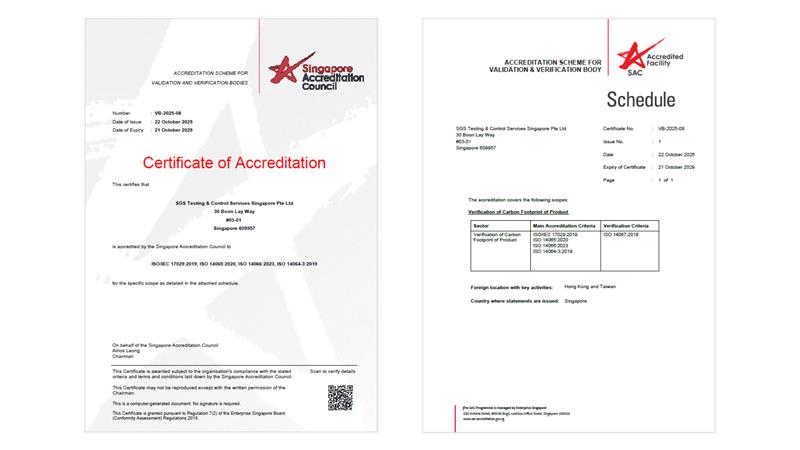 In October 2025, SGS had become the world's first Product Carbon Footprint Verification Body accredited by Singapore Accreditation Council (SAC) under ISO 14067.