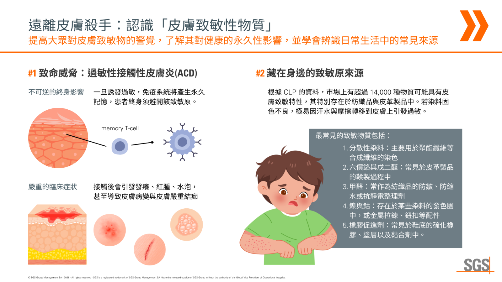 皮膚致敏性物質 (skin sensitizers) 是指在接觸皮膚後,會引發免疫系統過敏反應的化學物質。此免疫系統過敏反應為過敏性接觸性皮膚炎(ACD),將造成不可逆的終身影響!常見過敏症狀包括:發癢、紅腫、起水泡、大面積腫脹、嚴重的皮膚病變與結痂。