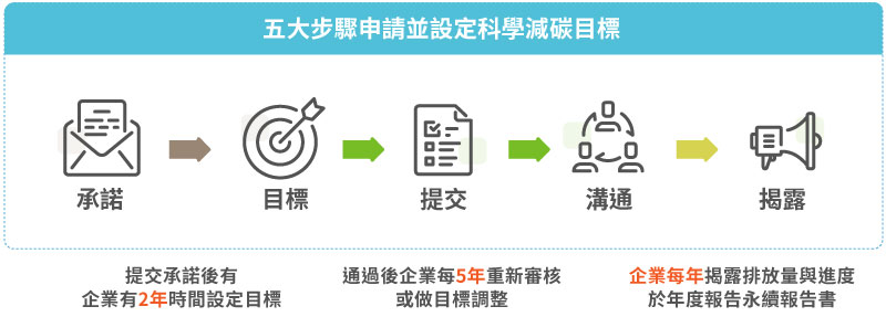 依據SBTi最新審核規範,企業可依循申請流程五大步驟,設定SBTi科學化減碳目標: