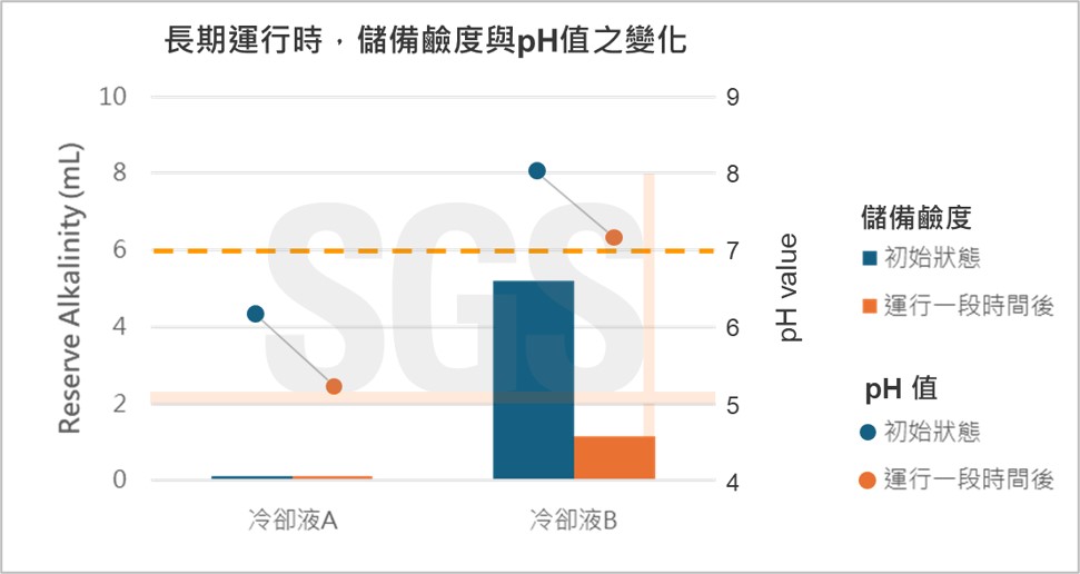 1. 冷卻液A未檢測到儲備鹼度,表示冷卻液恐無緩衝冷卻液變酸能力。運行一段時間後pH值變酸,對冷卻系統與金屬散熱組件有高度腐蝕風險。